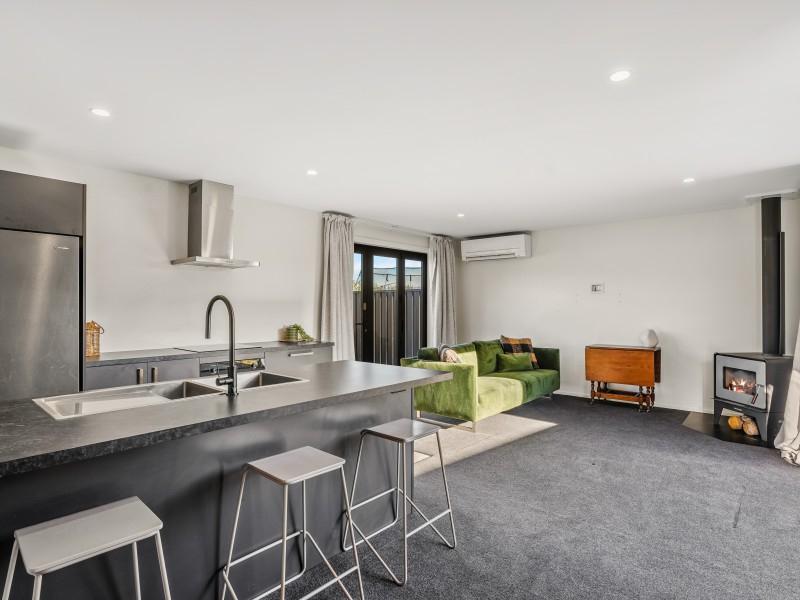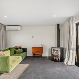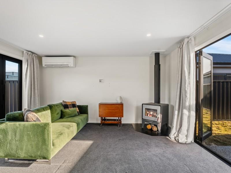 The home's clever layout offers three double bedrooms (including a primary suite with walk-in wardrobe and ensuite), a spacious family bathroom, and a separate lounge/media room. At the heart of the home, the open-plan kitchen, dining, and living space is complete with a walk-in pantry, wood burner, heat pump, and heat transfer system designed for year-round comfort.