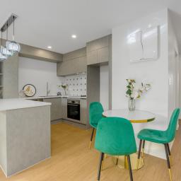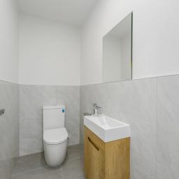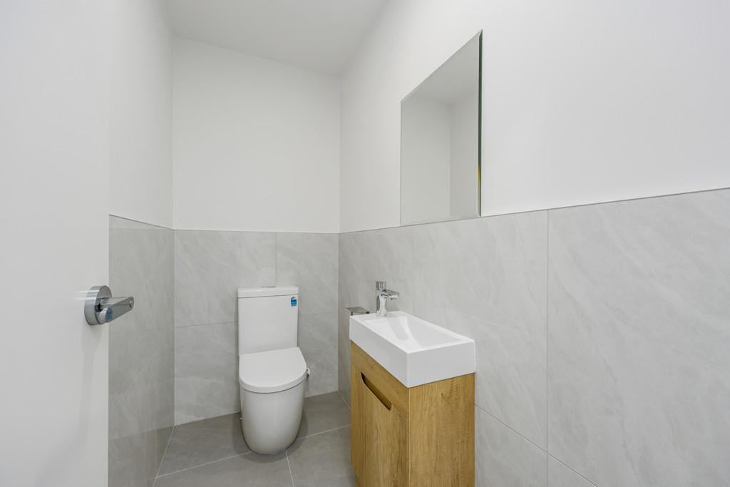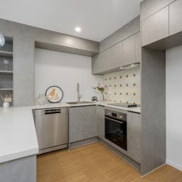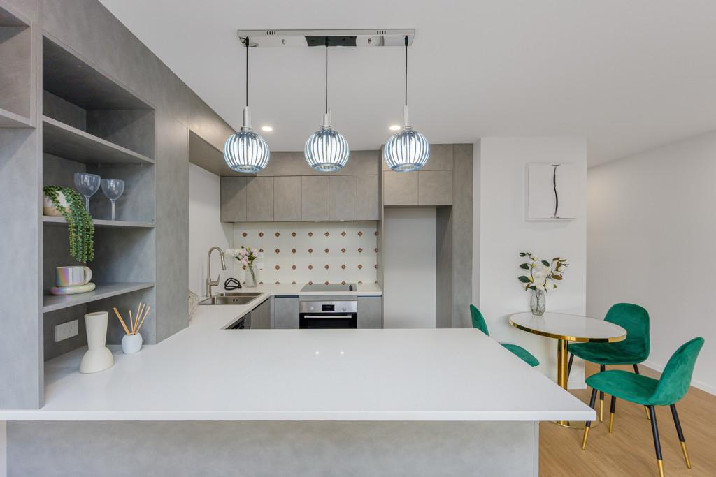 A tasteful interior decor displays durable timber laminate flooring in open plan ground floor living and dining areas with seamless flow to a small north facing front deck and another at rear as a covered, secluded alfresco courtyard. Copious natural light, LEDs throughout and some stylish statement pendants further enhance the impression of spaciousness. The highly-specced kitchen with gleaming appliances has abundant storage and built in shelving evoking a harmonious ambiance. This floor also includes double bedroom with deck access and tiled guest powder room and hideaway laundry hub.