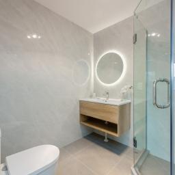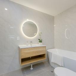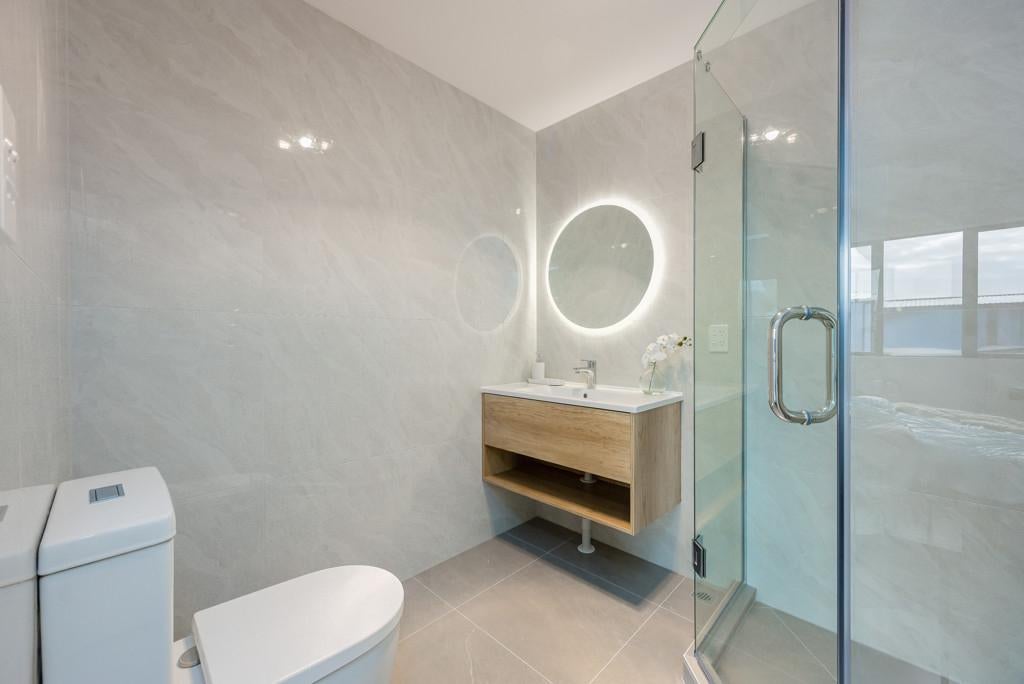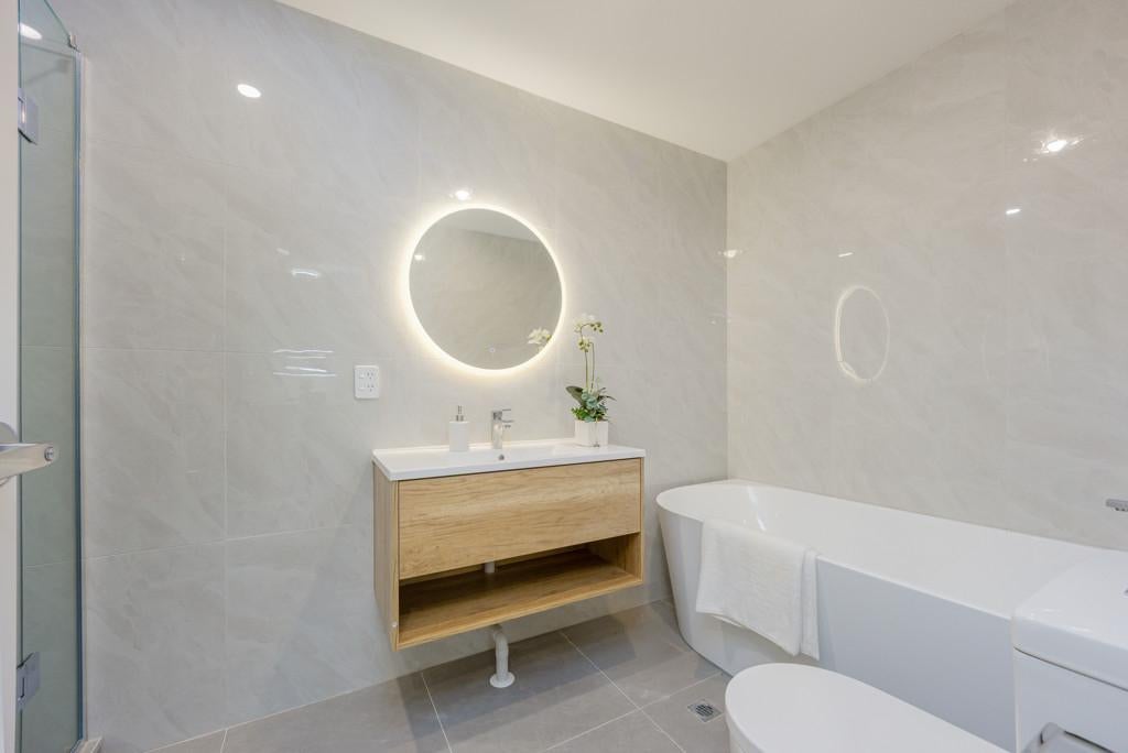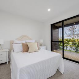 Upstairs, two more double bedrooms enjoy an elevated outlook with master having an ensuite and walk in wardrobe. Fully tiled and with back-lit LED mirrors and sleek chrome tapware, the bathrooms boast attractive floating vanities, frameless glass showers and one with bathtub. The home is fully insulated, with heat pumps and ample sun, assuring of year-round comfort.