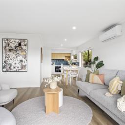 Inside, you'll find an inviting open plan living area that flows effortlessly onto a sunny north facing deck. Plus there is stylish new bathroom with huge family shower and new skylight, a separate toilet, separate laundry and 3 x double bedrooms. And for added practicality there are two linen cupboards and extra storage in the laundry. Additional highlights include new gas hot water, a new heat pump, new ceiling and underfloor insulation and an upgraded electrical switchboard.