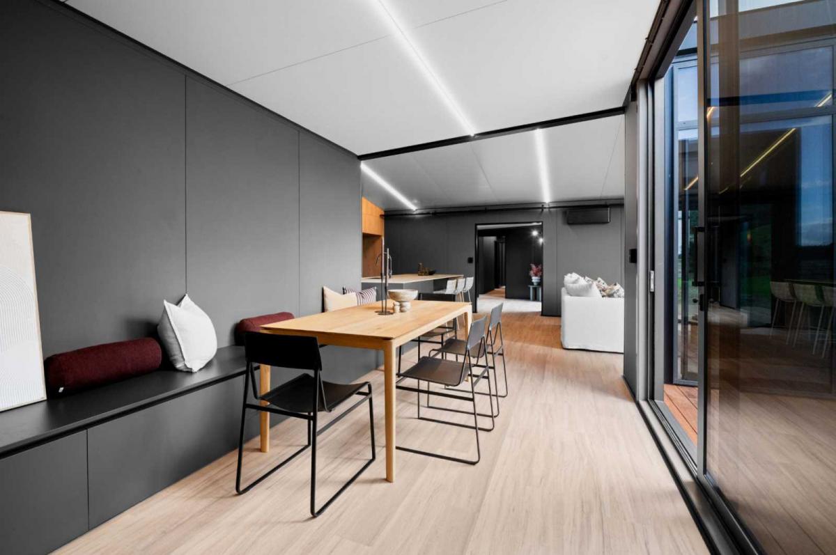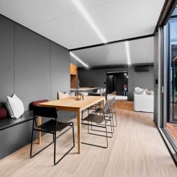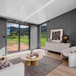 Step inside and you’re instantly greeted by full-height glass framing uninterrupted views of the Hakarimata Ranges—anchored by industrial Mr Ralph lighting and a sculptural bonsai maple. The layout is fluid, drawing you from the entryway into a warm, sunlit living zone grounded by natural flooring and a dining space complete with built-in bench seating and hidden storage.