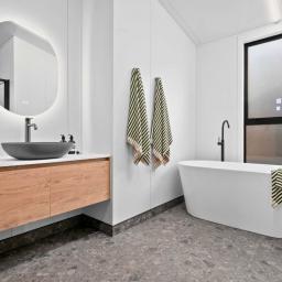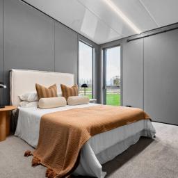 The four bedrooms are intelligently zoned for flexibility, function, and family life. Two rooms feature custom wardrobes, with one offering a built-in desk—ideal for study or remote work. Floor-to-ceiling windows bathe each space in natural light, with ambient Mr Ralph fittings adding a warm, moody finish. The main bathroom is tiled with LED-lit mirrors, a soaking tub, and gunmetal tapware.