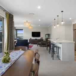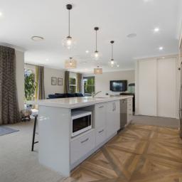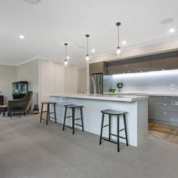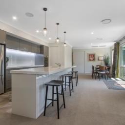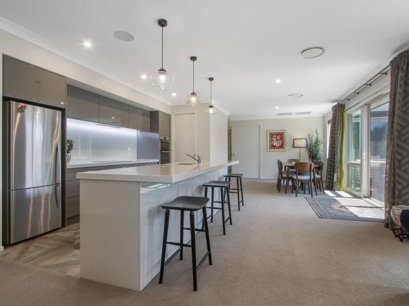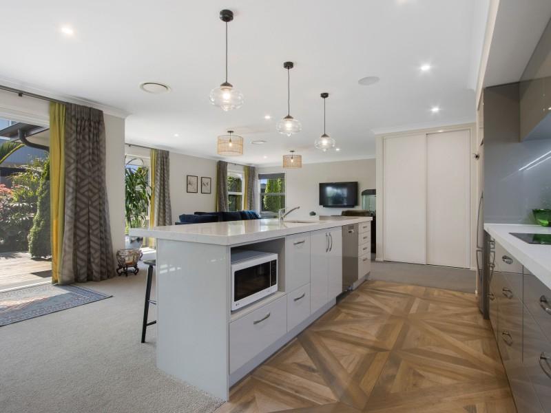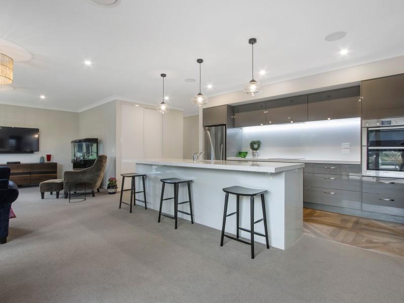 The main living area features a kitchen designed for both entertainers and culinary enthusiasts, boasting a large island, stone benchtops, and butlers pantry.
