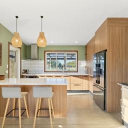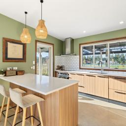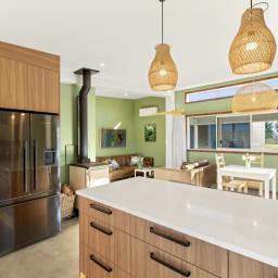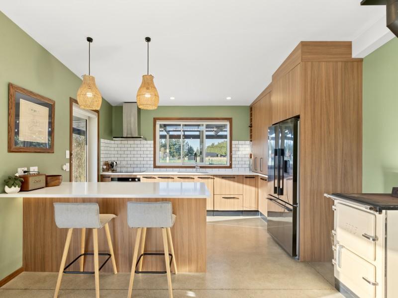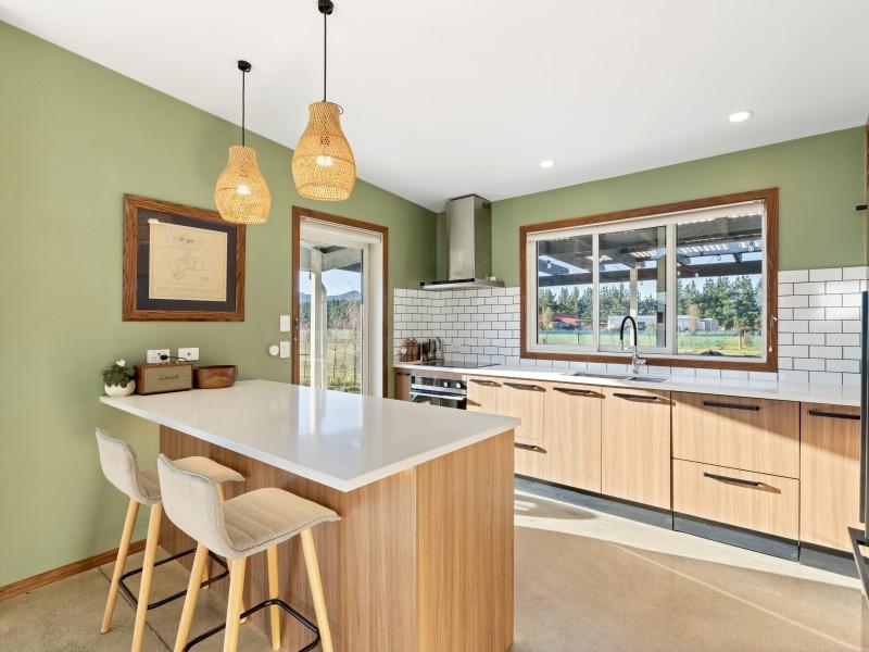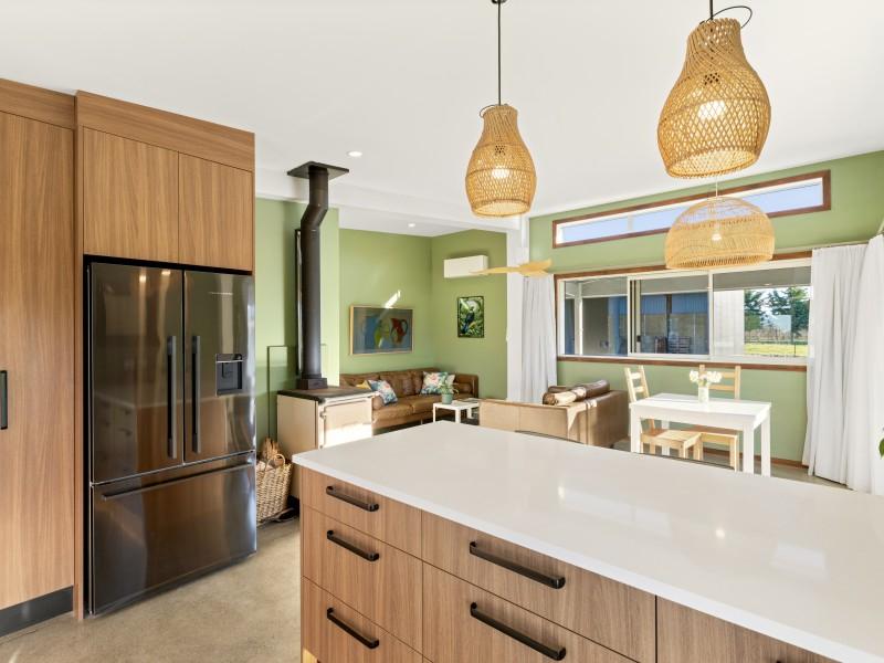 Step inside to polished concrete floors, clean lines and a sense of calm. The open plan kitchen, dining and living zone is light-filled and beautifully balanced – anchored by a large Esse wood fire, integrated smart LED lighting and a designer kitchen featuring quality appliances, subway tiles and a central island built for hosting. The palette is warm, the layout is functional and the flow to the outdoors seamless.