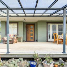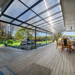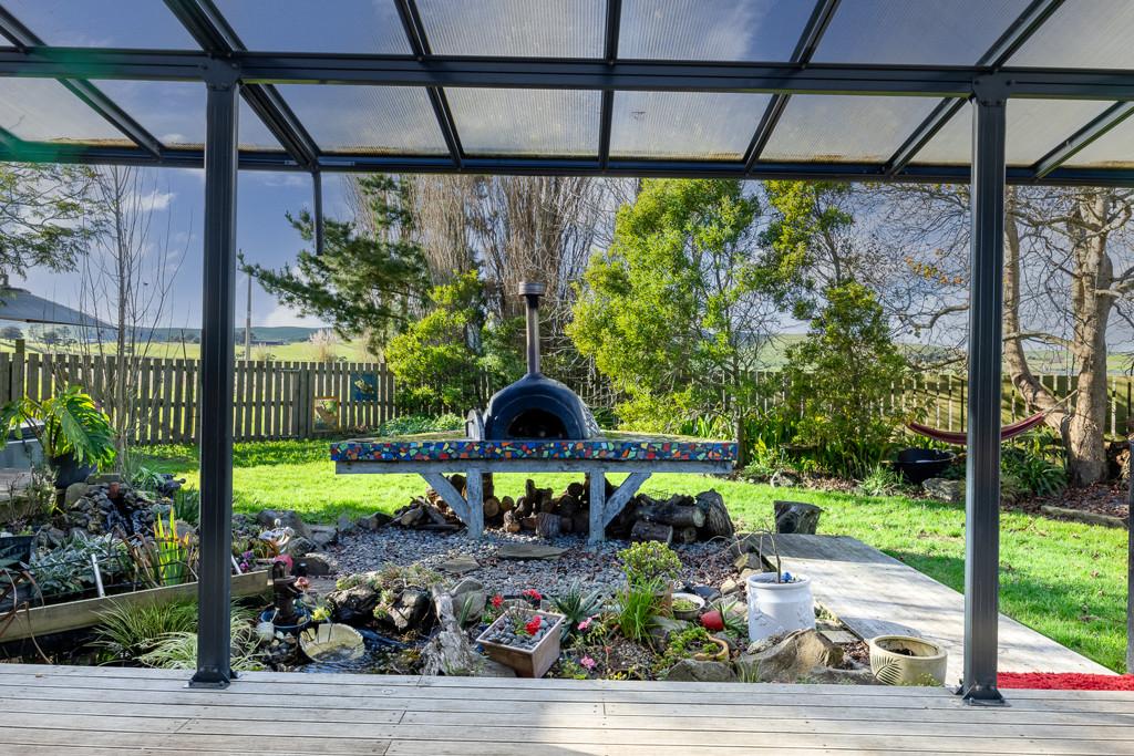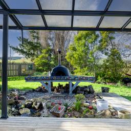 The front deck is covered for all weather entertainment, with built-in lighting. Loads of room for family and friends to entertain, stepping down to a patio and the gorgeous pizza oven.