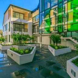 It is located at the end of a quiet cul de sac on the residential edge of Newmarket, Auckland's premiere shopping precinct.