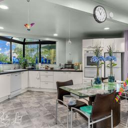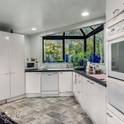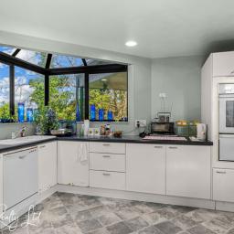 Inside, the open-plan kitchen, dining, and living area is filled with natural light, high ceilings, and large windows that create a bright, welcoming feel. Aluminum joinery and a cozy wood burner add comfort, while the kitchen includes a large pantry and awaits your personal refresh.