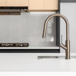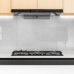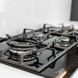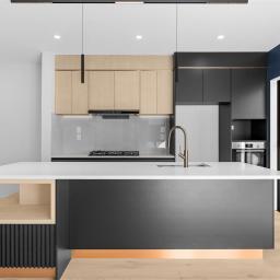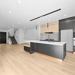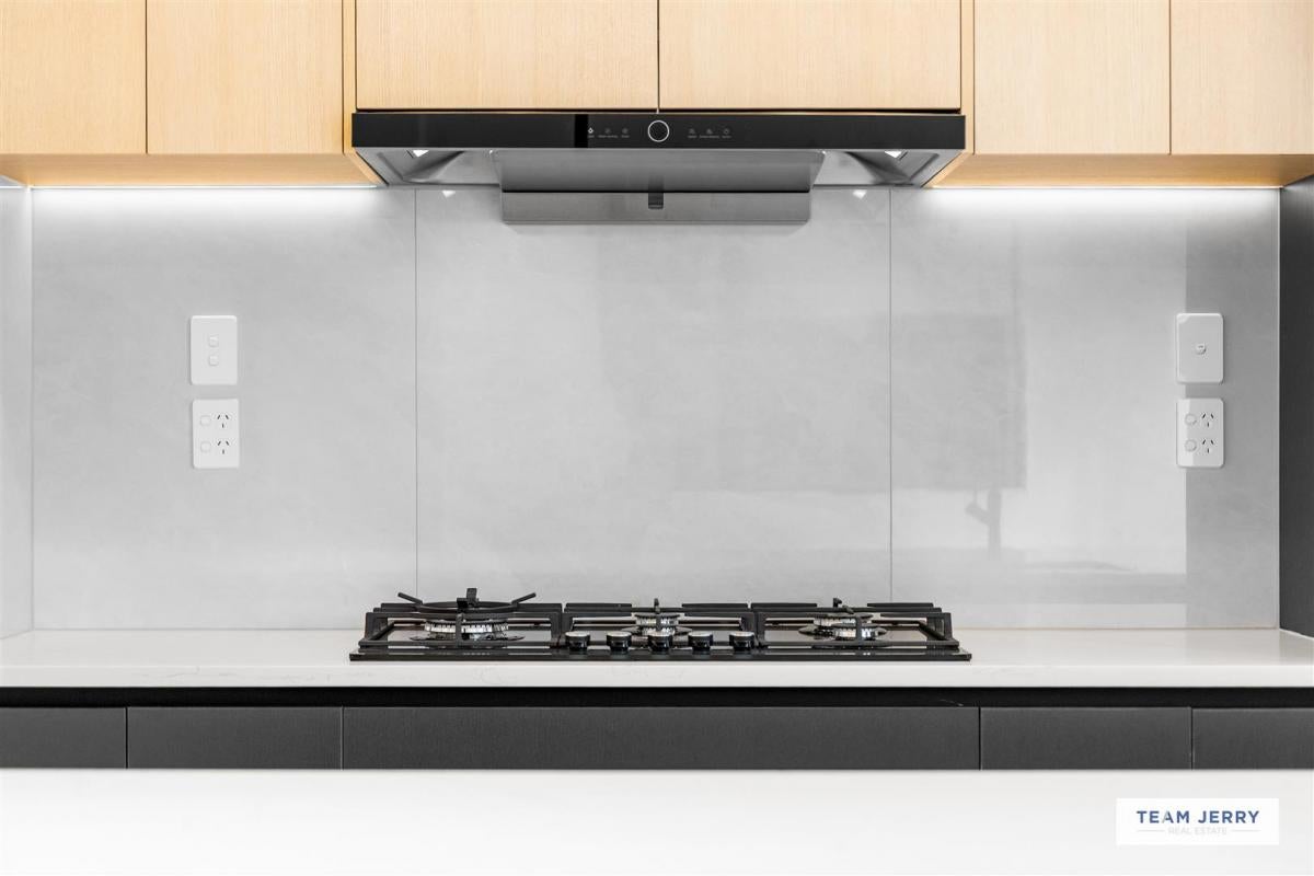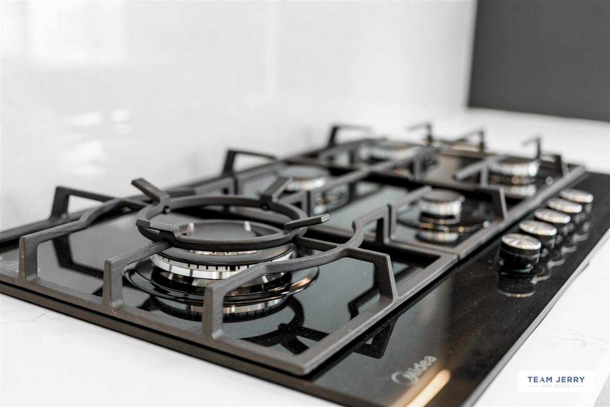 - Rear-set designer kitchen with stone island, gas cooking and LED-lit cabinetry