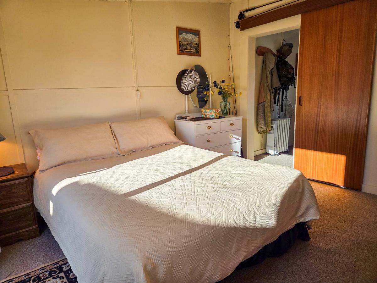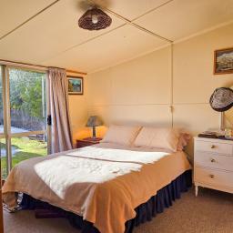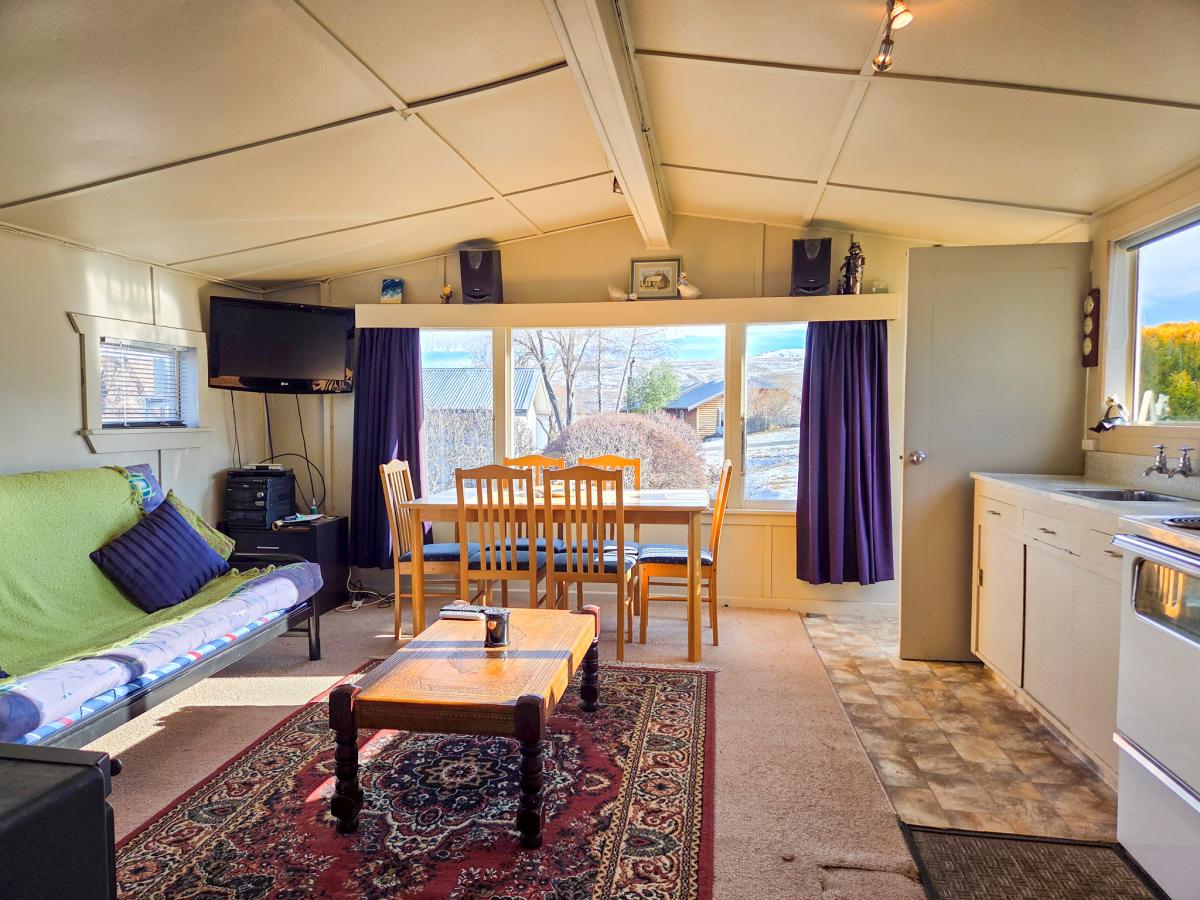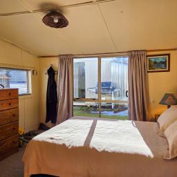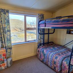 Step inside to find a warm, open-plan living space, where a crackling log burner sets the tone for cozy evenings. The dining area enjoys a large window with views of the dramatic mountain range drawing the outside in. A generously sized bedroom with a range slider opening to the idyllic outdoors adjoins the living area. A smaller bedroom featuring bunk beds leading off the main bedroom completes the interior. An outdoor bathroom offers a refreshing touch of rustic luxury under the stars. Featuring a flushing toilet and a shower, the bathroom is just a couple of metres away from the hut and its secluded deck area.