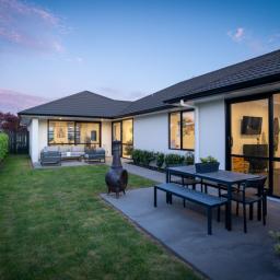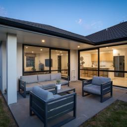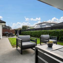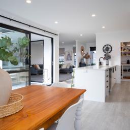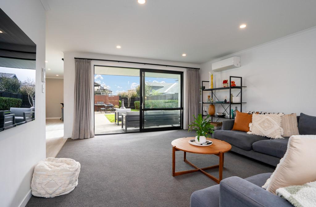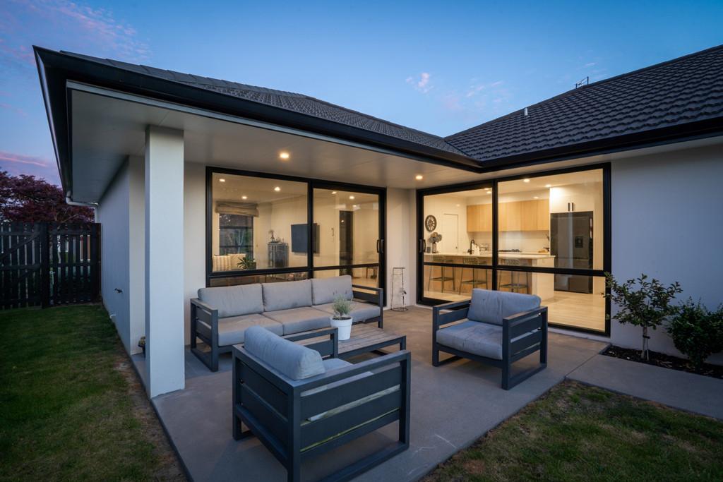 Large sliding doors connect both the kitchen and lounge to a covered patio and easy-care garden, creating a seamless indoor-outdoor flow perfect for entertaining or soaking up sunny afternoons.