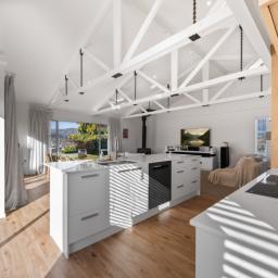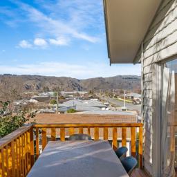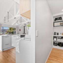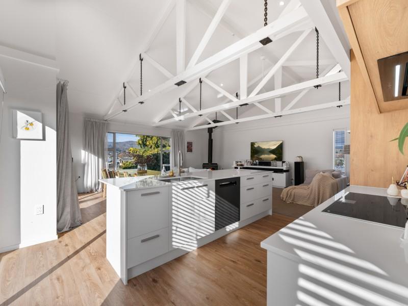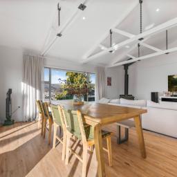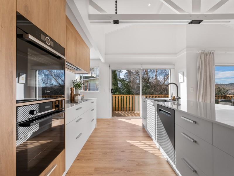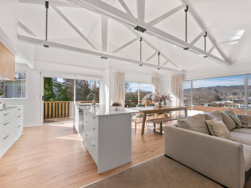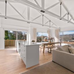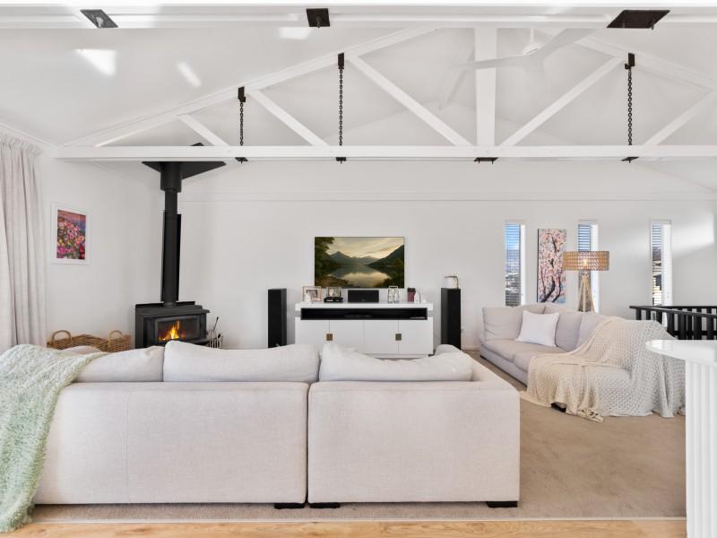Elevated to capture sweeping views over the town, the home features open-plan living with a contemporary kitchen, complete with a walk-in pantry. The modernised interior offers a fresh, light-filled atmosphere, ideal for both everyday living and entertaining.
