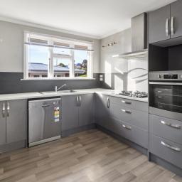 - The modern open-plan kitchen is equipped with a wall oven, cooktop, and dishwasher, making meal preparation a breeze