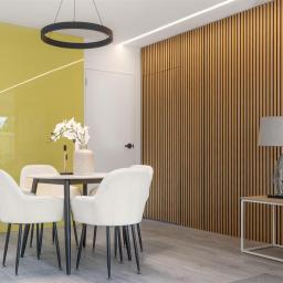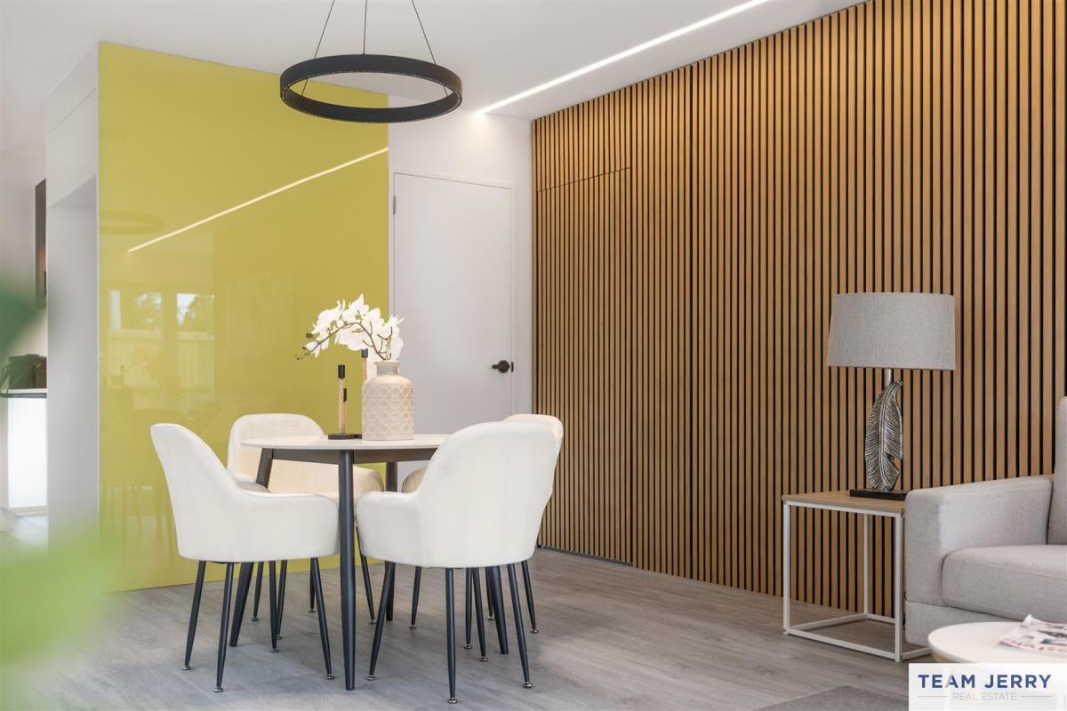 The ground floor exhibits an innovative open-plan design featuring a separate toilet, a dining area, and a living room, all leading to an elegantly streamlined garage that connects indoors.