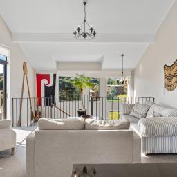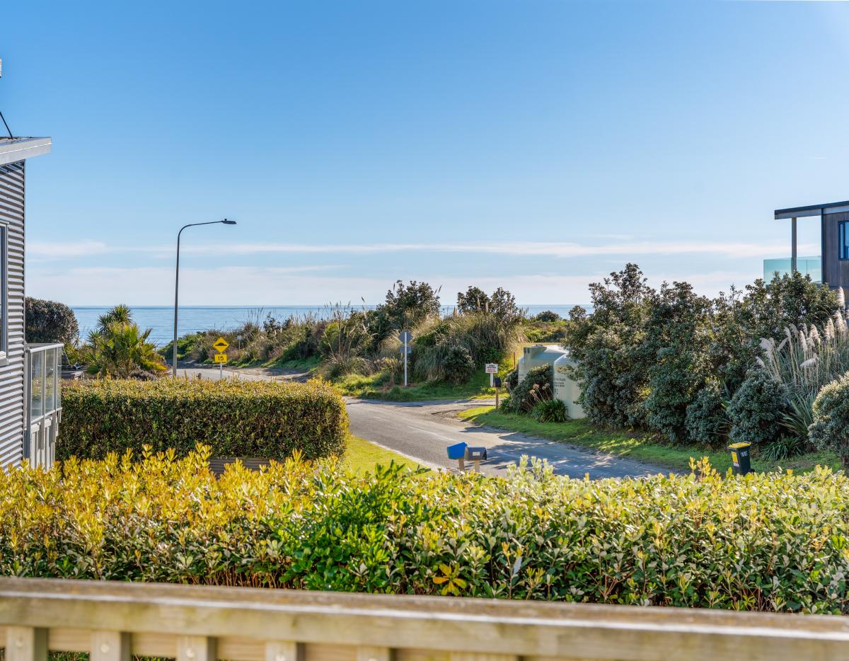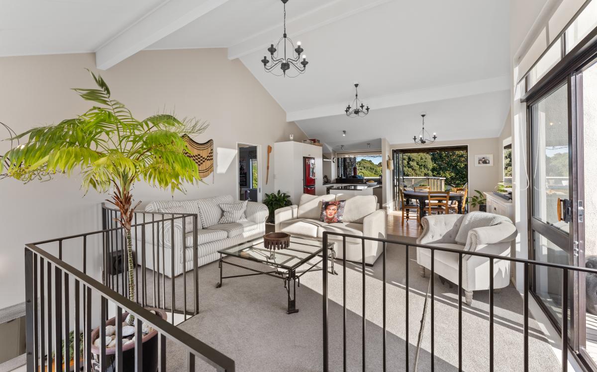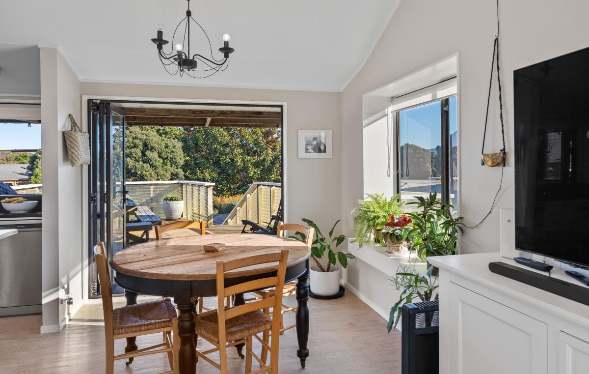The open-plan lounge is warm and welcoming, complete with a heat pump and direct access to a deck with views towards Peka Peka Beach – the perfect spot to enjoy the fresh sea air.