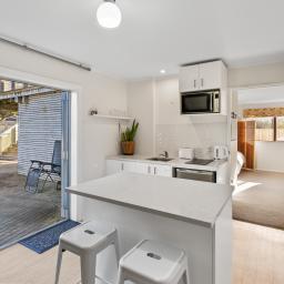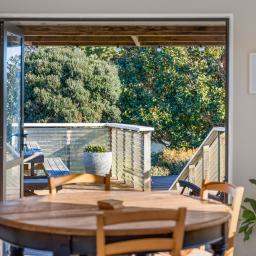Set across two levels, the main residence includes two bedrooms, a contemporary bathroom with a bath, and a spacious open-plan layout connecting the lounge, dining, and modern kitchen. The updated kitchen features a central island with breakfast bar seating, bifold windows that open to the deck, and great flow into the dining area, where a built-in window seat invites you to unwind.