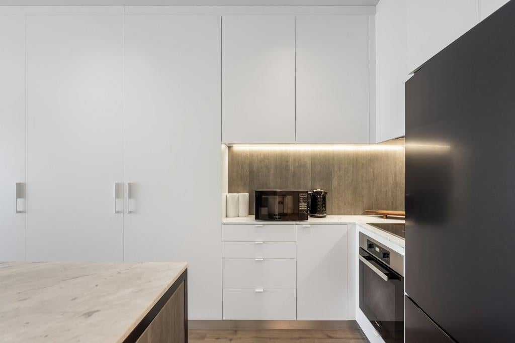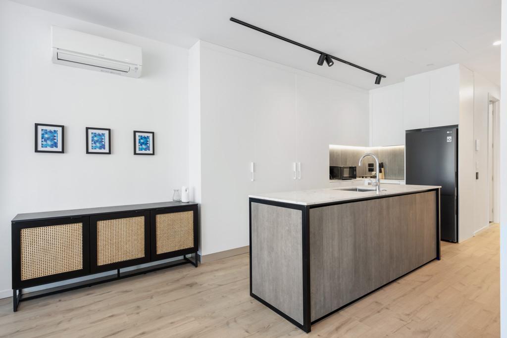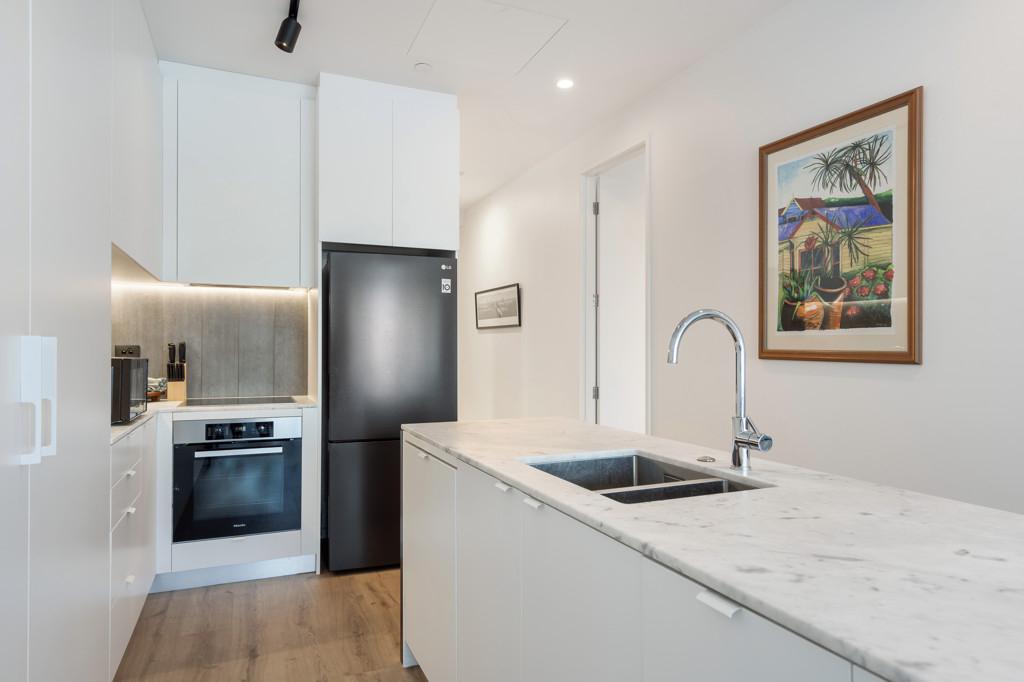 The sleek, contemporary kitchen looks out across the lush greenery and the vibrant buzz of the neighbourhood, connecting you seamlessly to the outdoors.