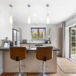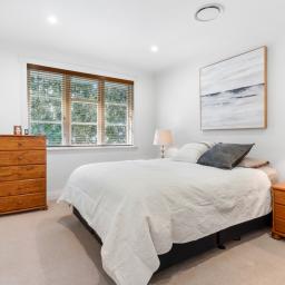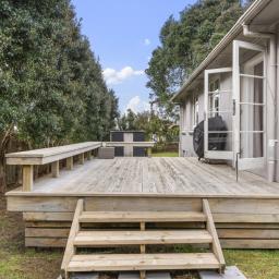 Tuis sing in the Pohutukawa trees, and you can enjoy the sun on the north-facing deck, which leads out from French doors for seamless indoor/outdoor flow. Surrounded by evergreen trees and a graceful row of Italian-style conifers gives a tranquil feeling of being in the countryside.