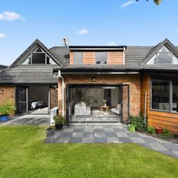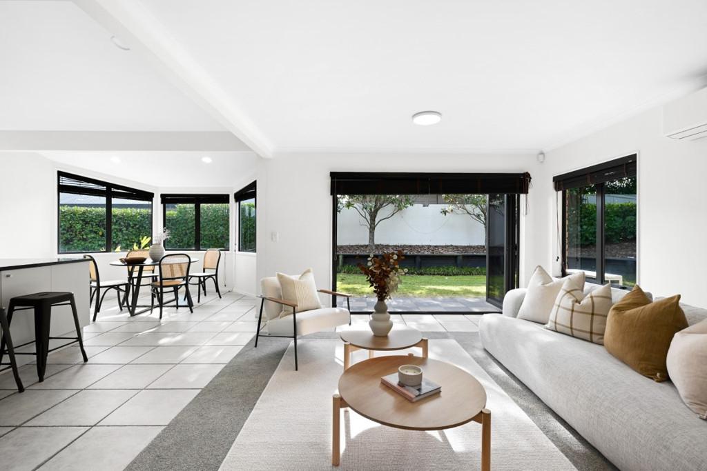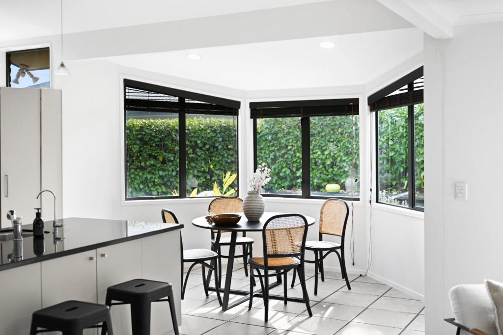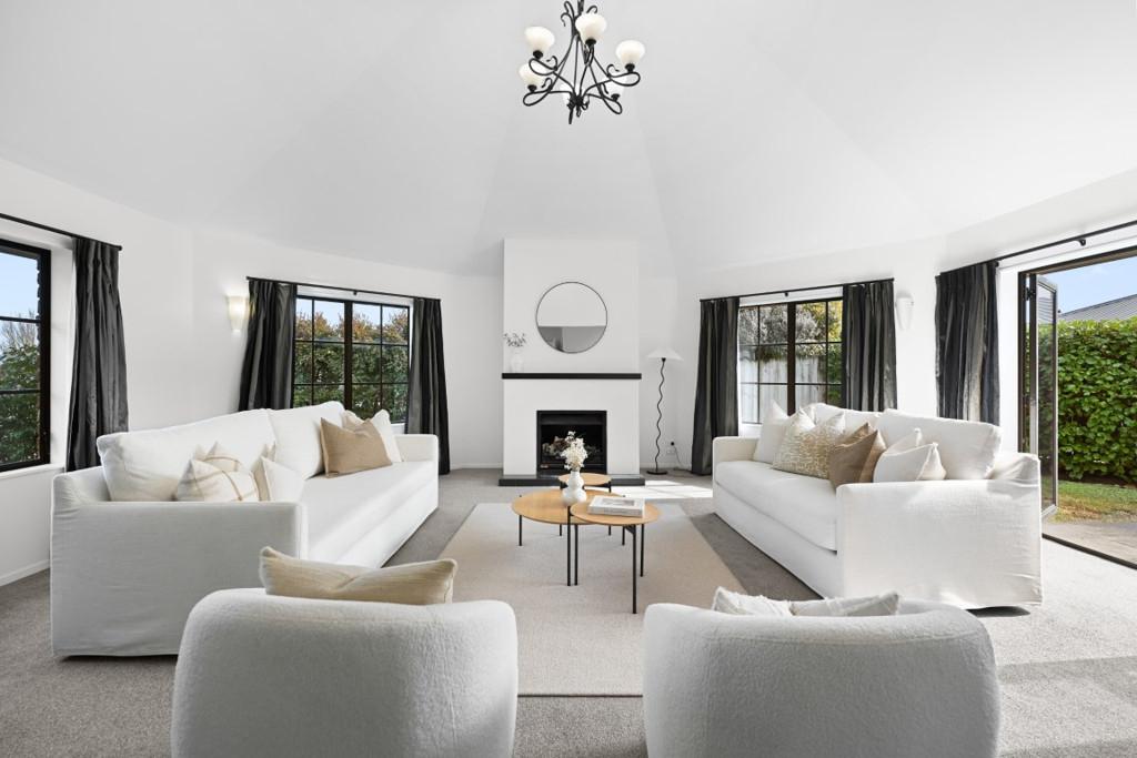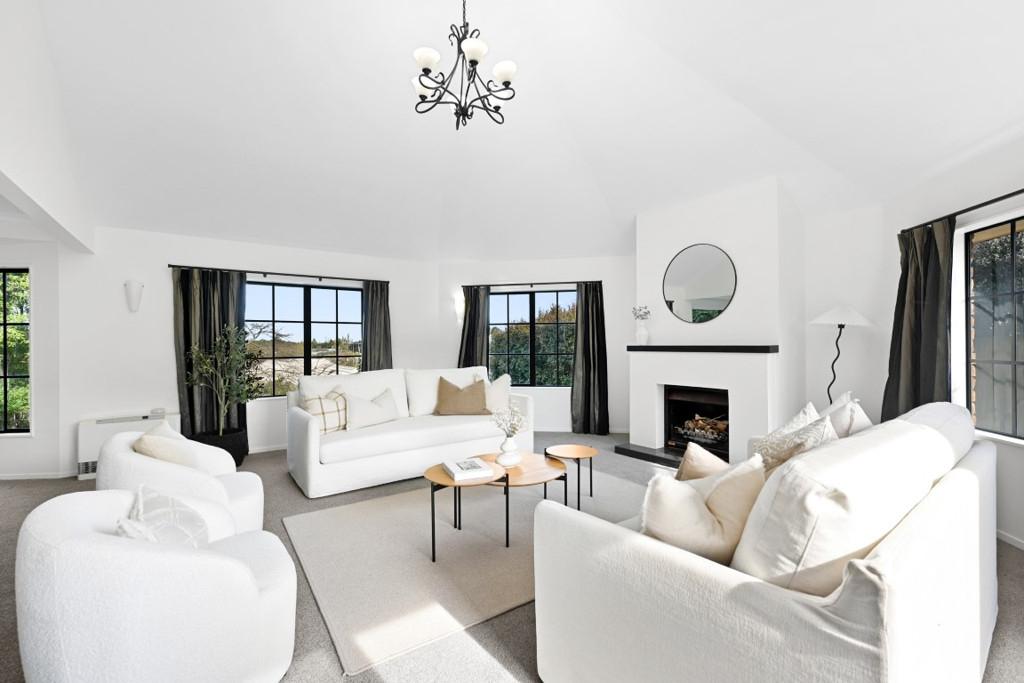 The main dining area is perfectly positioned to link the kitchen to the second living zone, where a cozy gas fire and expansive windows set the tone for relaxed evenings or gatherings with friends and family. This entire wing also opens out to the landscaped grounds, ensuring indoor-outdoor flow is at the forefront of daily living.