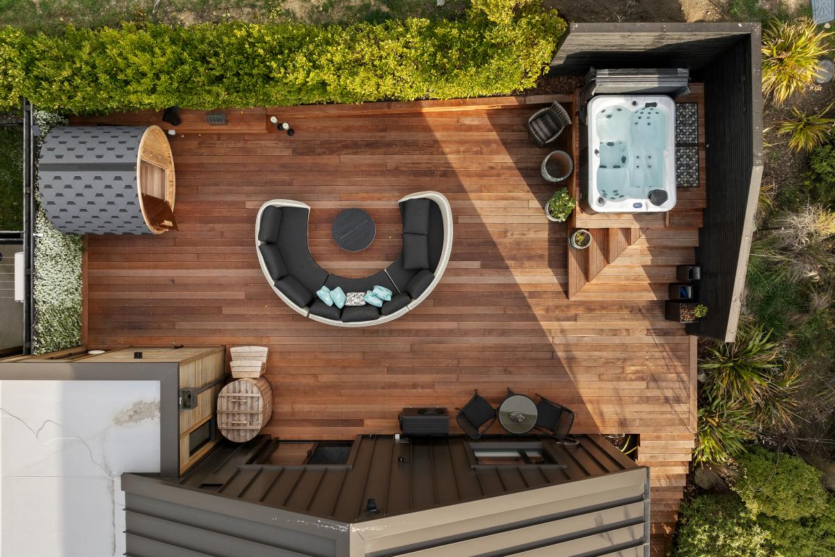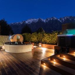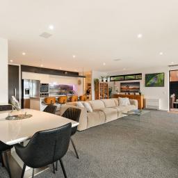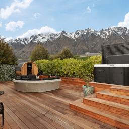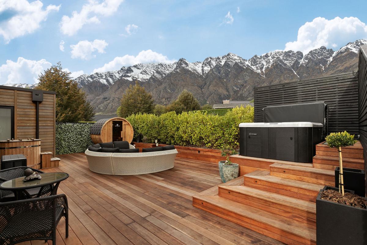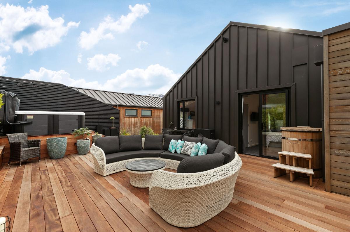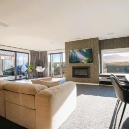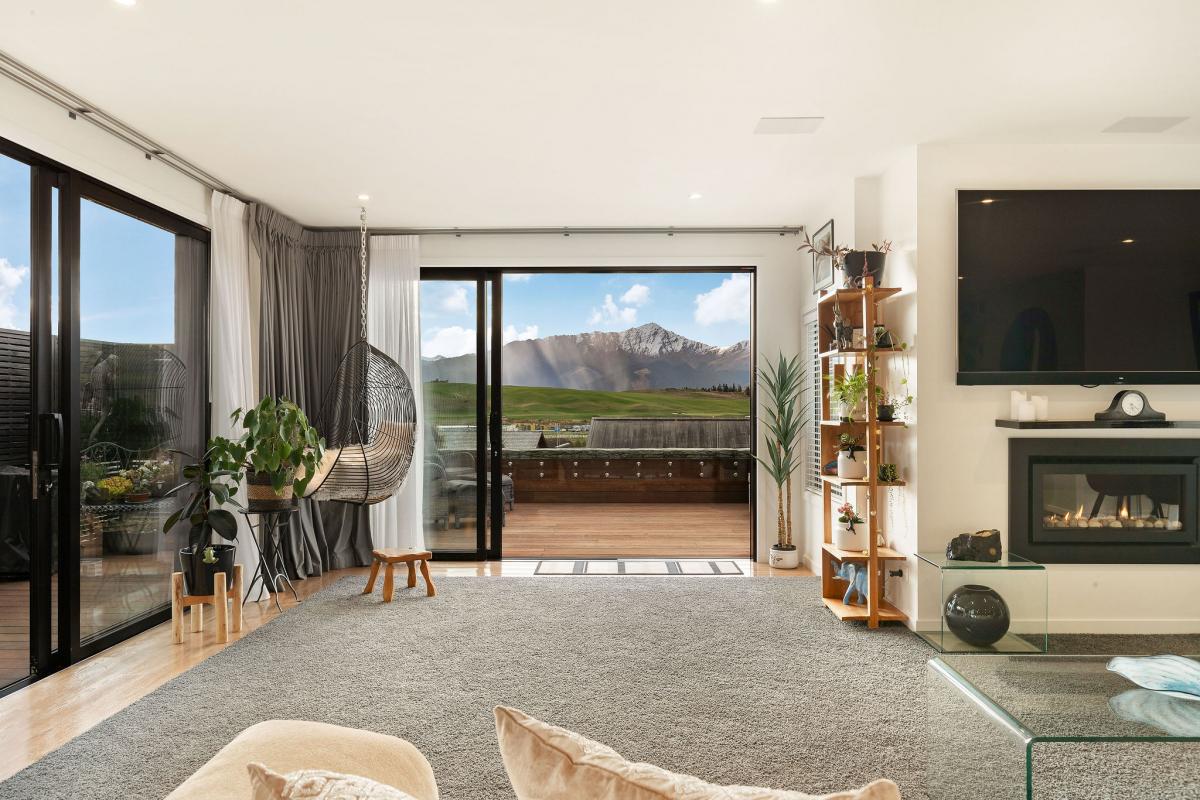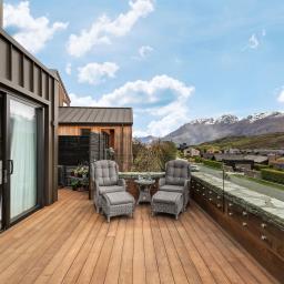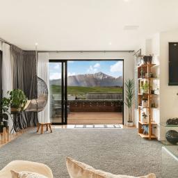 The chef's kitchen is a showstopper: finished in sleek gloss white cabinetry, it features double ovens, induction and gas hobs, ample storage, a butler's pantry and pull-out cupboards. The open-plan living and dining areas are expansive and filled with light, showcasing uninterrupted views across Jack's Point Golf Course and the surrounding mountain ranges. Boasting over 100sqm of wraparound private Kwila decking, the outdoor living experience is truly unparalleled. The expansive front-facing deck offers sweeping panoramic views, perfect for enjoying breathtaking sunsets and fresh alpine air. At the rear, a secluded and spacious deck provides the ideal setting for entertaining guests or unwinding.