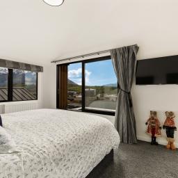 The guest bedroom opens directly to a private courtyard-style deck, while the second bedroom easily accommodates two singles, both with large double wardrobes, additional storage space and uninterrupted views of The Remarkables. The master suite is a sanctuary, complete with his-and-her wardrobes, a window seat with storage, and a luxurious ensuite featuring a full bath, walk-in shower and dual vanities. West-facing windows allow abundant light to fill this space.