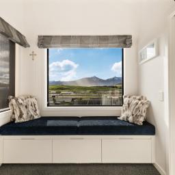 For year-round comfort, the living areas are equipped with a heat pump, an Escea gas fireplace, and a built-in window seat with clever storage.