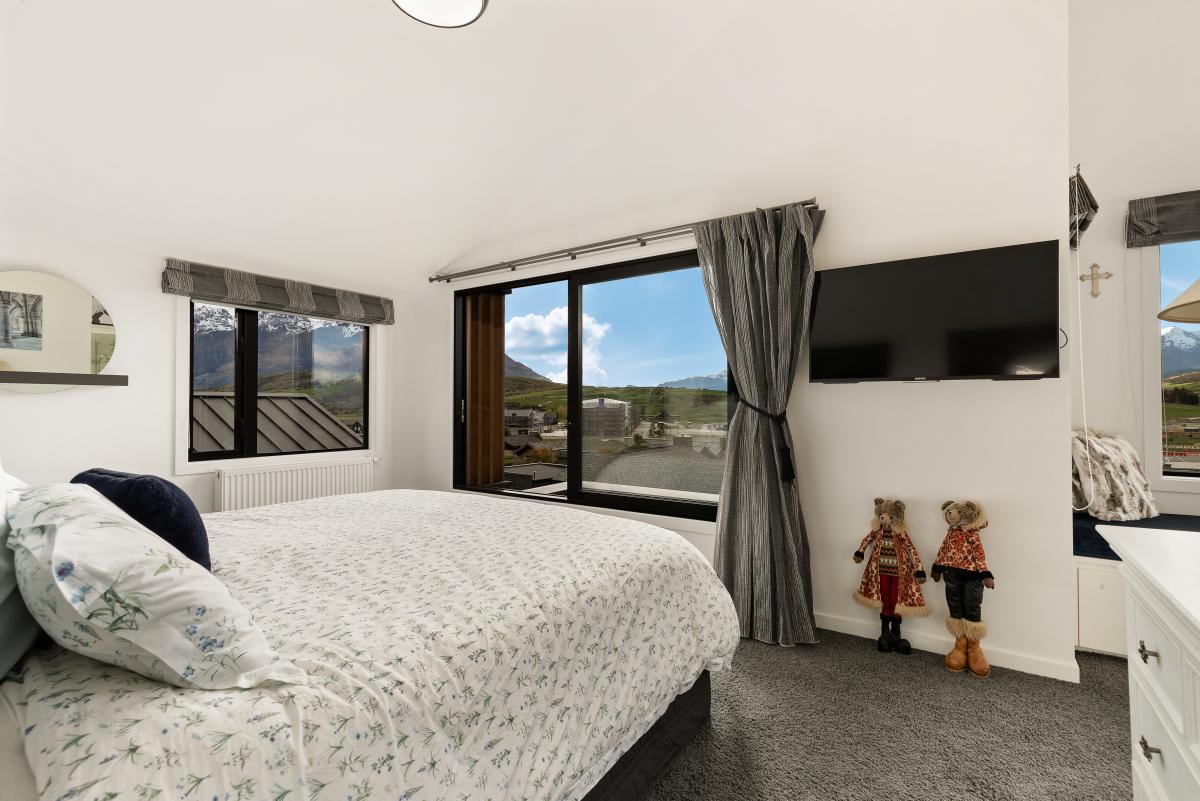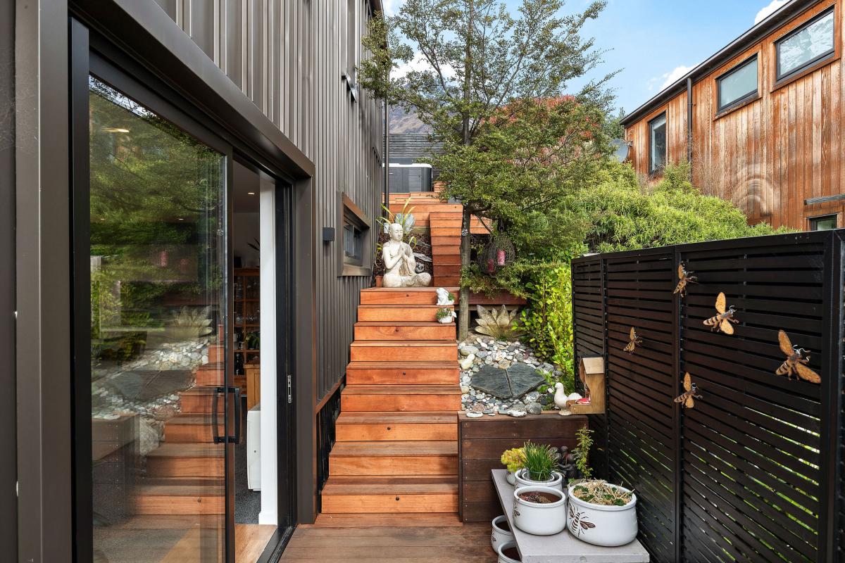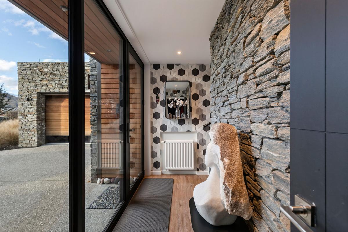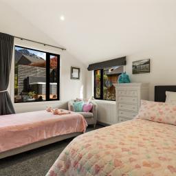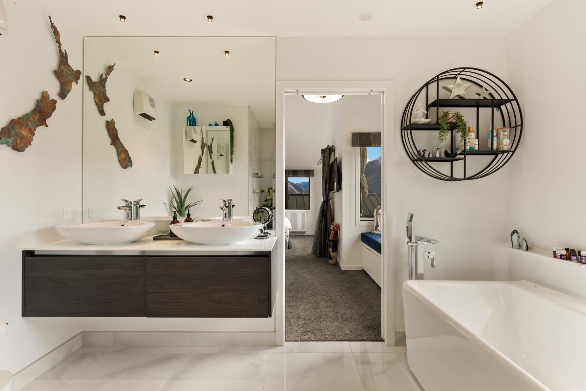 Upstairs, the home continues to impress. From the rear door, you'll glimpse the dramatic peaks of The Remarkables. A central hallway connects three generous bedrooms and a beautifully appointed bathroom with a double shower. A discreetly hidden laundry and linen cupboard enhance the home's functionality.