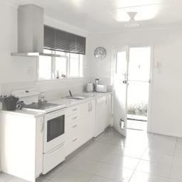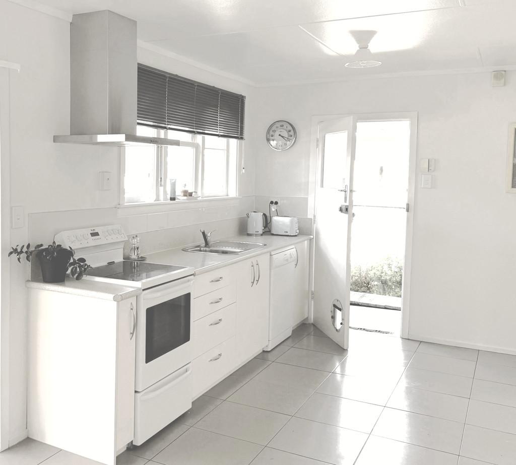 An updated kitchen with rangehood and dishwasher, fresh decor, and open-plan living that seamlessly connects to a private, sun-drenched north-facing deck through French doors off the kitchen and off the lounge.