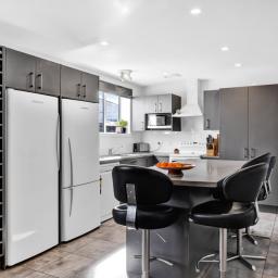 The well-appointed kitchen is a delightful hub, featuring modern appliances, ample storage, and a functional layout that makes cooking a pleasure. Enjoy casual meals at the central breakfast bar.