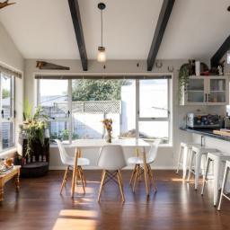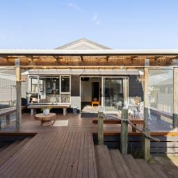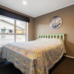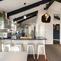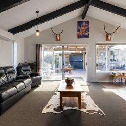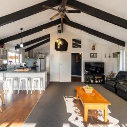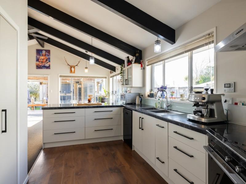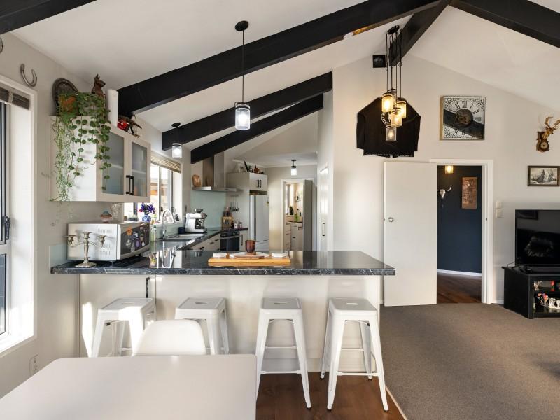 Large open-plan living zone is enhanced by raked ceilings and an abundance of light beaming through the multiple sets of windows. A well-appointed kitchen has excellent storage and a dishwasher, plus the living and dining area is warmed by a heat pump, flowing effortlessly to the outdoors.