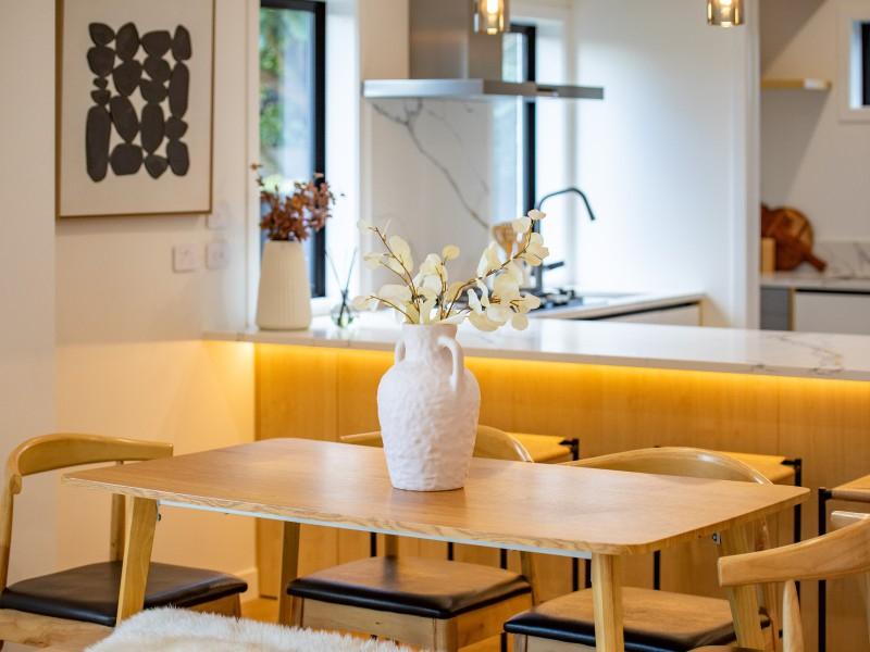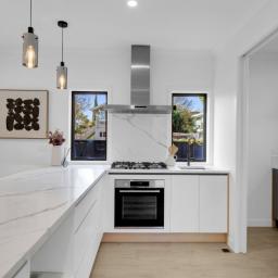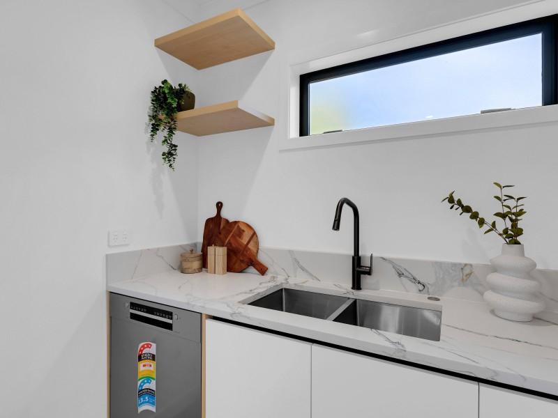 The kitchen combines form and function with generous bench space, great natural light, and a hidden scullery featuring double tubs and ample storage—keeping the living area sleek and uncluttered.