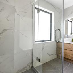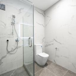 Upstairs, three additional bedrooms provide generous space for the family, all serviced by a well-appointed bathroom featuring a shower box, bathtub, and a double-sink vanity with an LED mirror—designed for both practicality and comfort.