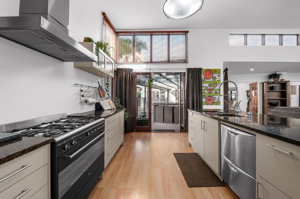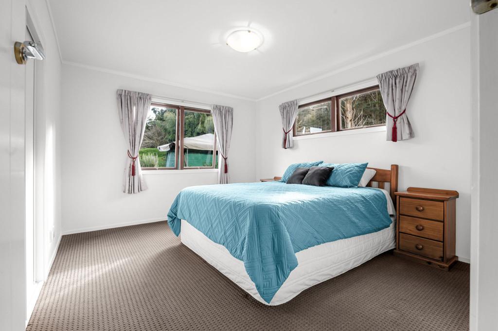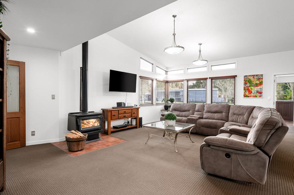 The main residence is a substantial four-bedroom, two-bathroom home, refreshed with new paint and designed for family life. Open-plan living and dining areas centre around the kitchen, where wide glazing draws the outdoors in. A separate office and a two-car garage with excellent storage enhance the layout.