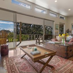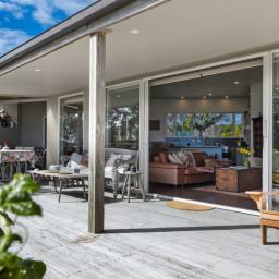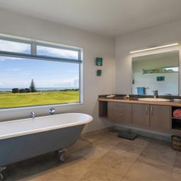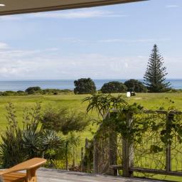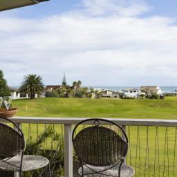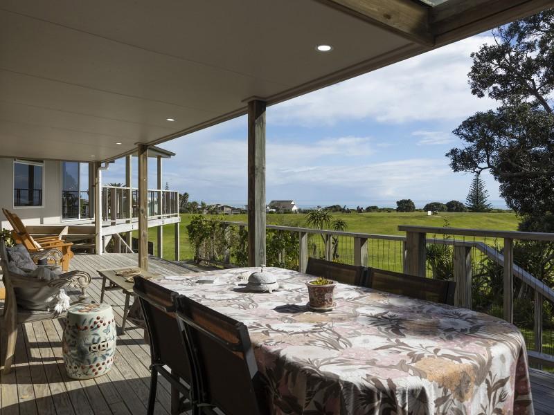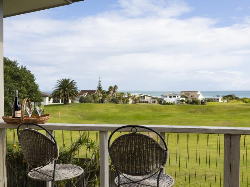 • North-facing, partially covered decks with stairs to the garden and views over the golf course towards the sea