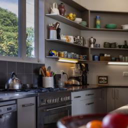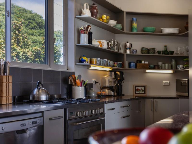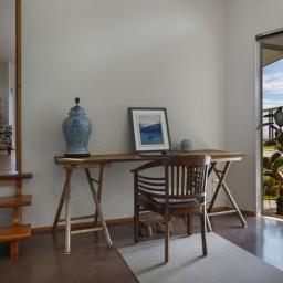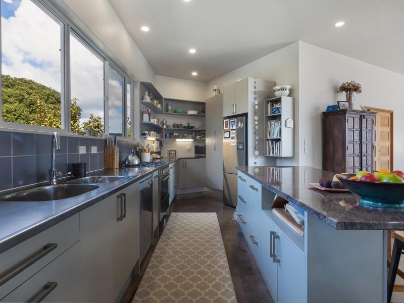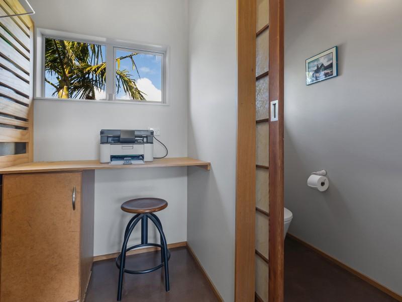 A sheltered outdoor area under the upper level is ideal for hobbies or entertaining. From there, a private utility area houses two large water tanks and hidden clotheslines.
