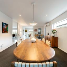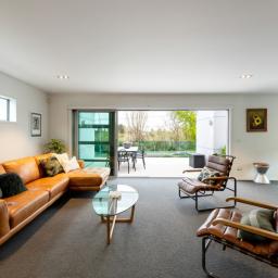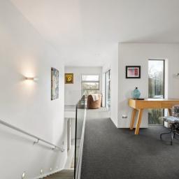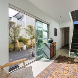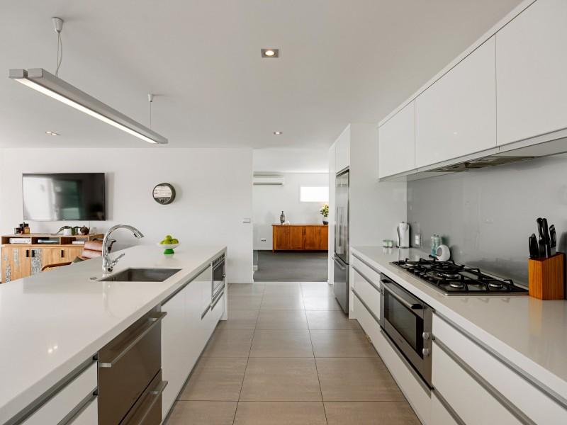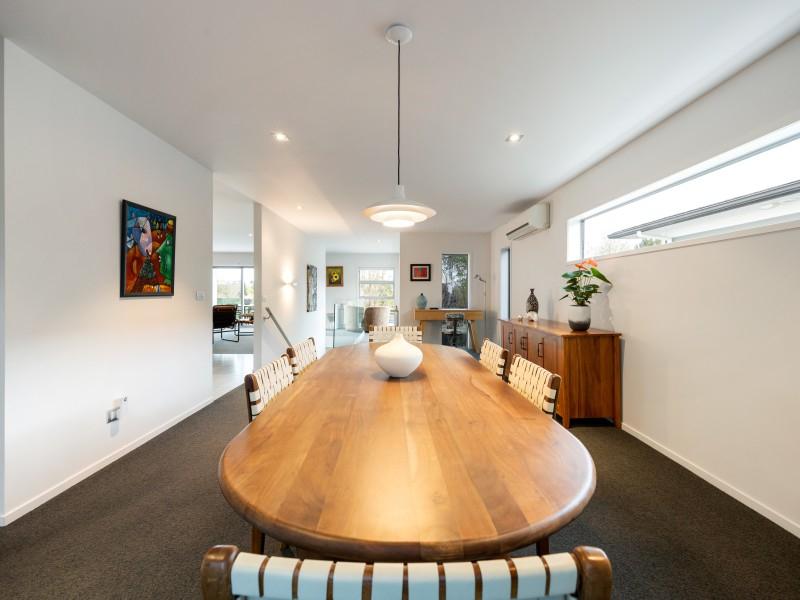 At the heart of the home lies a well-appointed entertainer’s kitchen, complemented by expansive glazing that fills the interiors with natural light. Sophisticated touches like underfloor heating, heat pumps, and quality finishes throughout elevate everyday living. The central staircase makes a striking first impression, uniting both levels with effortless flow.