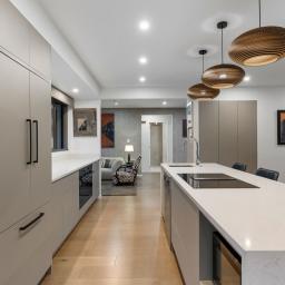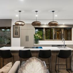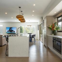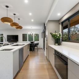 Inside, the home has been meticulously transformed. Fully gibbed and insulated in walls, ceilings, and floors, it features engineered oak flooring, new plush carpet, and fresh paint and wallpaper throughout. The heart of the home is the open-plan kitchen, dining and living zone, opening effortlessly to the deck and river beyond. A designer kitchen takes centre stage with an integrated fridge, Miele appliances, and an island bench with an induction downdraft cooktop.