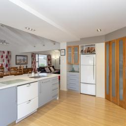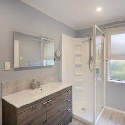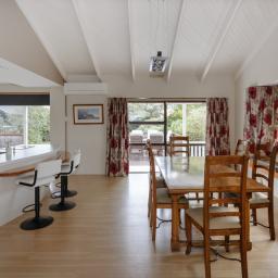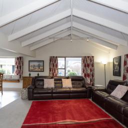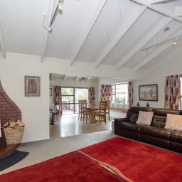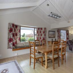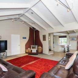 The unexpected spaciousness is revealed upon entry with the vaulted ceilings and large open plan living, dining, and kitchen area, where year-round comfort is provided by both a woodburner and heat pump.