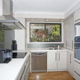 • Modern kitchen with stone bench, electric hob, range hood, wall oven and dishwasher
