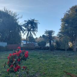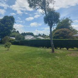 The property boasts a lush, grassy area complemented by mature trees set back from the road on a rear section, creating a serene private outdoor retreat for relaxation and entertainment.