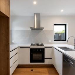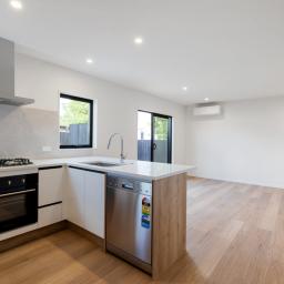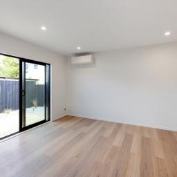 Bathed in natural light, the north-facing layout is anchored by an open-plan living space that blends relaxation and entertaining seamlessly. The sleek kitchen showcases Stonex benchtops, premium appliances including gas cooking, and a handy breakfast bar. Sliding doors extend the living outdoors, while upstairs you'll find two generous double bedrooms, both have their own ensuite complete with quality fittings and tiled finishes. A guest toilet on the ground floor, double glazing, a security system, and central air conditioning add comfort and peace of mind.