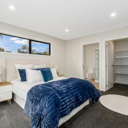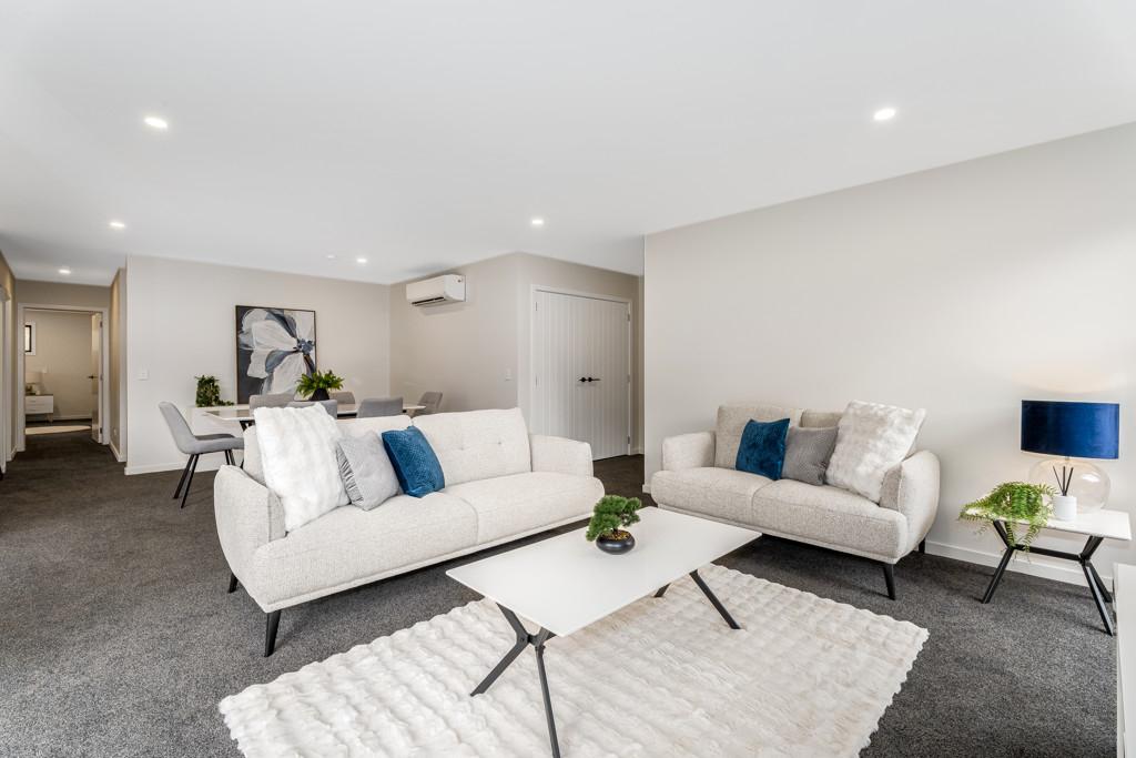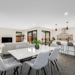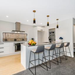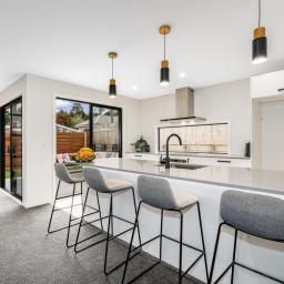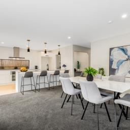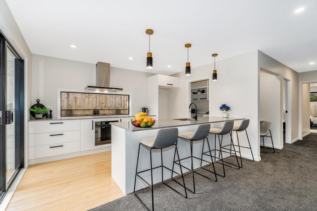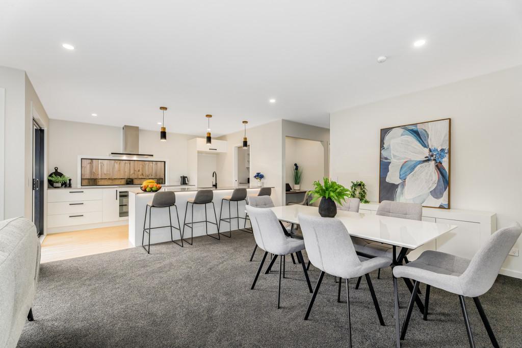 At the heart of the home is a modern kitchen with engineered stone benchtops and a stylish breakfast bar. It flows seamlessly into the open-plan living and dining area, creating a welcoming space for entertaining or relaxing. Bamboo flooring adds elegance, while carpeted zones offer cosy comfort underfoot.