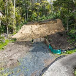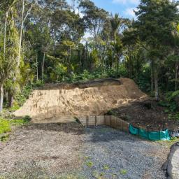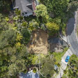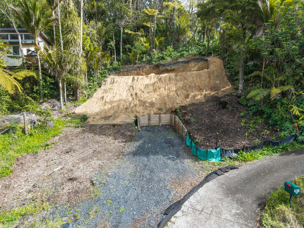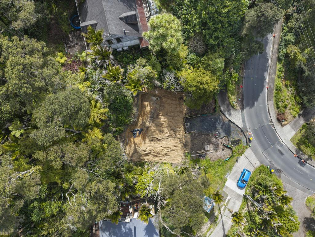 From the excavated building platform, with all services connected, the outlook stretches eastward across the treetops towards South Titirangi Road, with elevated views and generous sunlight.