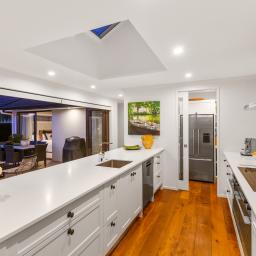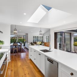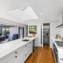 Striking in design, the home showcases high-stud ceilings, Velux skylights, over-height doors, designer interiors, luxurious wool carpets, and oak hardwood flooring. Underfloor heating is carried throughout, while a gas feature fireplace adds a touch of warmth and ambiance. At the heart of the home, the gourmet kitchen boasts twin ovens, an induction hob, and a full scullery with additional sink and double-door fridge—perfectly complementing the open-plan living and alfresco flow. A separate lounge provides a peaceful retreat.