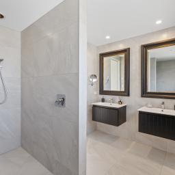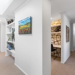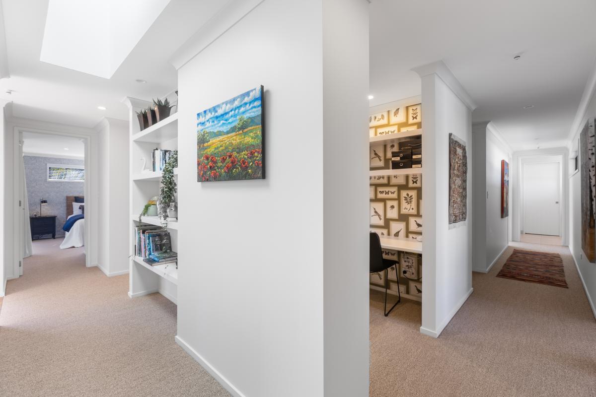 Accommodation includes four beautifully appointed bedrooms, with the primary suite featuring a superbly customised walk-in robe. A dedicated home office with bespoke cabinetry caters to modern work-from-home needs, while the luxurious fully tiled bathrooms, ensuite, and powder room with walk-in showers elevates the home to another level.