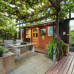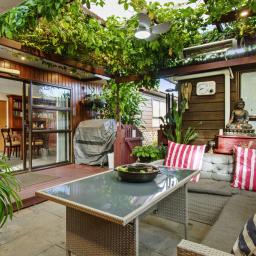 And when it comes time to host, you'll love the private outdoor oasis. Sliding doors lead to a lush, covered entertaining area under a greenery-draped pagoda, complete with paving, a ceiling fan, lighting, heater, and even a bar for serving up drinks in style. This is where relaxation lives.
