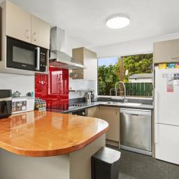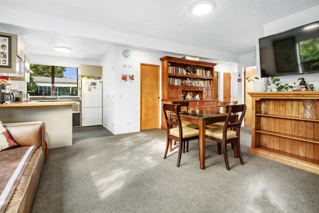 Inside, the open-plan living and dining zone is generous in size, kept comfortable year-round by a second heat pump. The stylish kitchen features a bold red splashback, ample bench space, and a good-sized pantry-ideal for day-to-day ease or entertaining with flair.