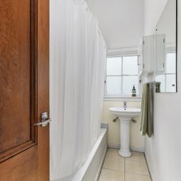 - Bathroom with shower-over-bath and pedestal basin plus separate toilet off renovated laundry