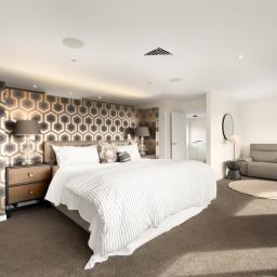 The interiors are defined by their generous proportions and sense of light, with full height glazing and high ceilings creating a seamless connection to the exterior landscape. At the heart of the home, the designer kitchen with butler's pantry anchors expansive open plan living and dining areas, complemented by a formal lounge and office. The ground floor also offers 2 bedrooms and a family bathroom, ensuring flexibility for guests or extended family.