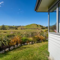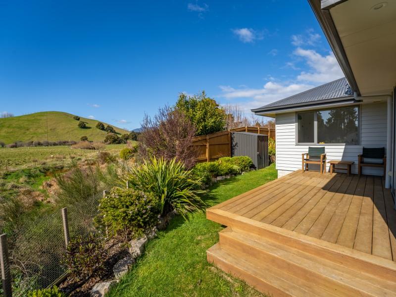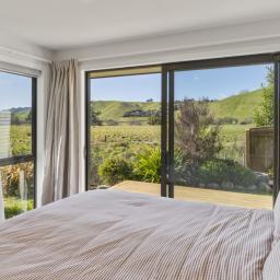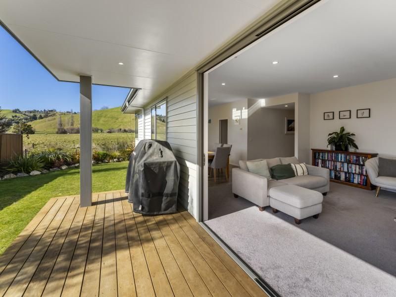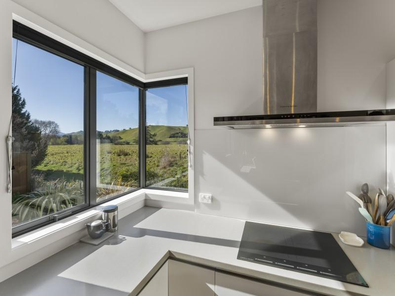 The living area is bathed in natural light, enhanced by high ceilings that create a sense of openness and flow. Large windows frame a peaceful rural outlook, offering a calm backdrop whether you’re entertaining or simply relaxing at home.