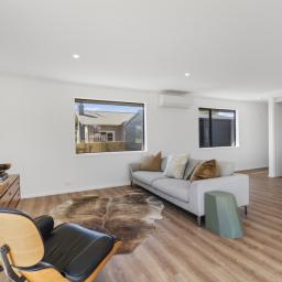 A Panasonic heat pump and Rinnai Infinity hot water ensure year-round comfort. Flooring is practical and stylish, with vinyl planking, soft carpet, and large-format tiles.